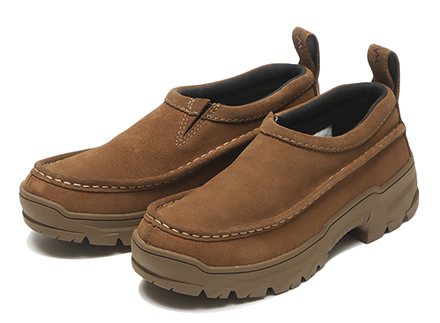 特徴的なモカ縫いは職人による手縫いで、スエードの質感と相まって静かな存在感を放ちます。
